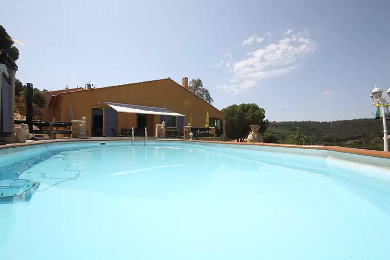 Elle est au calme et bénéficie d'une jolie vue dégagée. Piscine en béton privée et grand garage. Agence Bormes immobilier Tel : 04 94 62 71 99