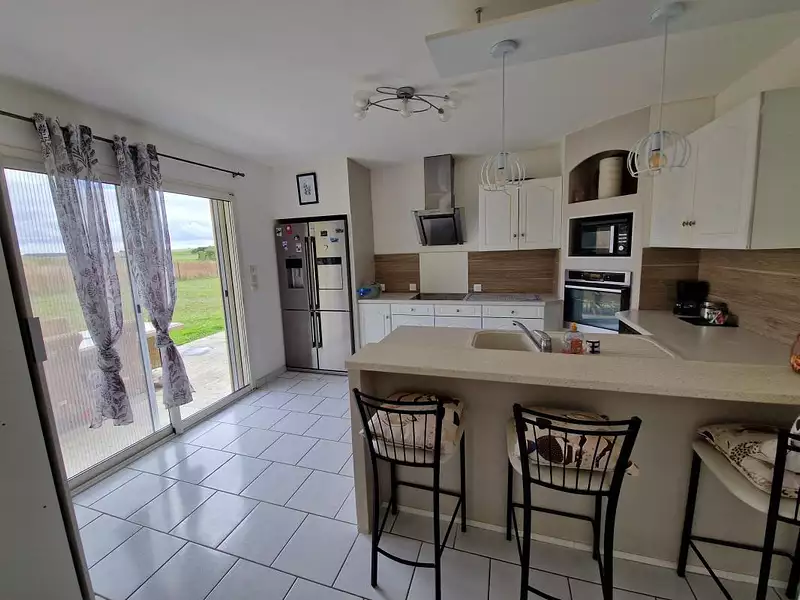 De plain-pied, il comprend une cuisine aménagée et équipée, un grand salon séjour donnant sur une terrasse avec vue sur la campagne, une salle de bain avec douche et baignoire, WC.