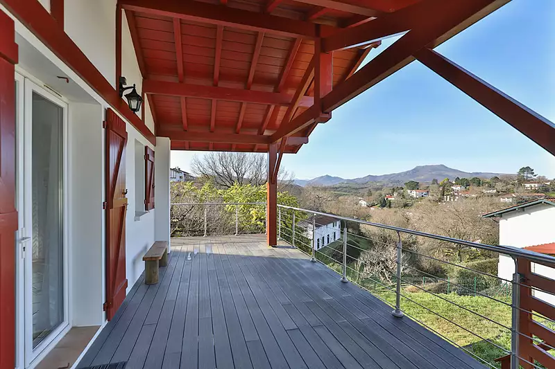 Idéalement située à proximité immédiate du lac de Saint-Pée-sur-Nivelle, cette superbe maison en position dominante offre une vue panoramique exceptionnelle sur les montagnes. Construite en 2002 et parfaitement entretenue, elle séduit par son cadre naturel préservé et sa belle luminosité. D'une superficie généreuse et répartie sur deux niveaux, elle propose : Au rez-de-chaussée : Un séjour/cuisine spacieux de 40 m² avec charpente apparente et une belle hauteur sous plafond de 3,55 m, Une terrasse abritée de 35 m², exposée sud-ouest, idéale pour profiter du panorama, Une entrée avec placards, Un bureau/chambre avec un espace buanderie, Un WC indépendant. Au rez-de-jardin : Trois chambres donnant toutes sur le jardin grâce à une porte-fenêtre, Une suite parentale avec dressing et salle d'eau, Une salle de bain, Un WC indépendant. L'ensemble est implanté sur un terrain de 1034 m², parfaitement aménagé, avec un garage de 30 m² et deux cabanes de jardin. Vous recherchez un cadre de vie privilégié, entre lac et montagne, avec un environnement calme et verdoyant ? Cette maison est faite pour vous ! Sans vous déplacer, profitez d'une visite virtuelle de ce bien à 360°.