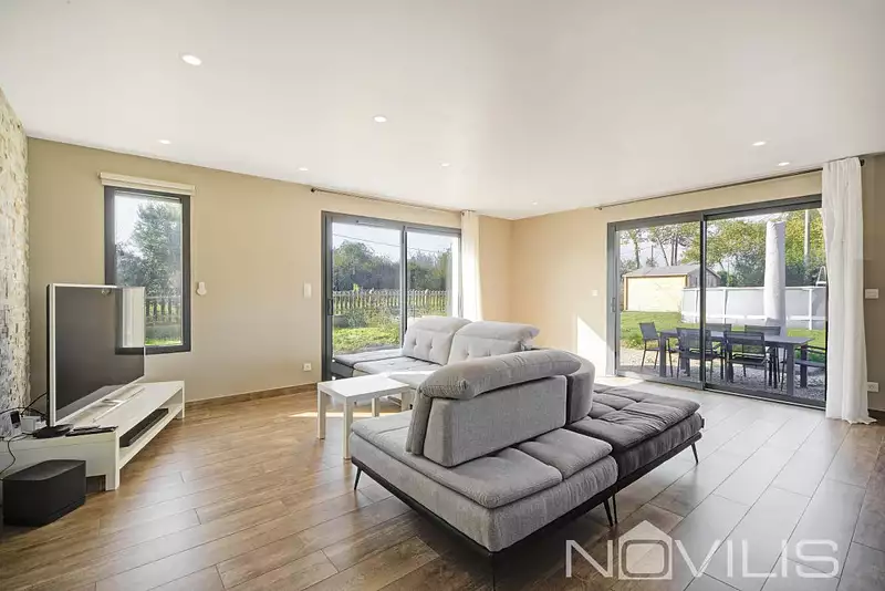 La salle de bains principale de 7,76 m² est équipée d'une double vasque, d'un miroir connecté et d'une fenêtre. L'ensemble est chauffé, rafraîchi et alimenté en eau chaude par une pompe à chaleur, garantissant un excellent confort thermique et une haute performance énergétique. La maison est entièrement équipée d'un système de domotique permettant le pilotage centralisé des volets roulants, du chauffage et de plusieurs équipements, pour un confort optimal au quotidien et une gestion intelligente de l'énergie. La parcelle de 1 394 m² est plate, facilement aménageable, et offre de nombreuses possibilités d'aménagement extérieur. Cette maison neuve, livrée clés en main, a été conçue avec goût et souci du détail. Aucun travaux à prévoir. Elle conviendra parfaitement à une famille recherchant un cadre de vie moderne et fonctionnel, tout en restant proche des commodités.