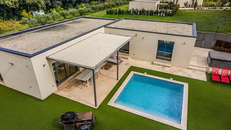 À l'extérieur, profitez d'un agréable jardin sans vis-à-vis, autour d'une piscine moderne. La terrasse avec pergola invite à la détente, tandis que le terrain de pétanque promet de beaux moments conviviaux en famille ou entre amis.