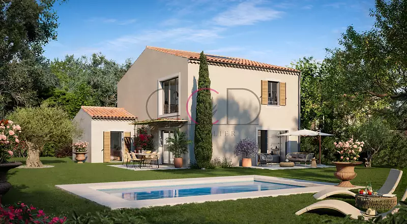 Niché au coeur d'un domaine paysagé clos et sécurisé, avec en son coeur un mas au charme ancien, découvrez cette villa neuve T5 individuelle élégante avec terrasse, piscine et garage privatifs.
