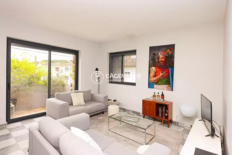 L'espace de vie se compose d'une cuisine semi-ouverte au style contemporain, sublimée par deux verrières qui apportent caractère et luminosité. Celle-ci s'ouvre sur un salon-séjour convivial où l'on imagine aisément des moments de partage en famille ou entre amis.