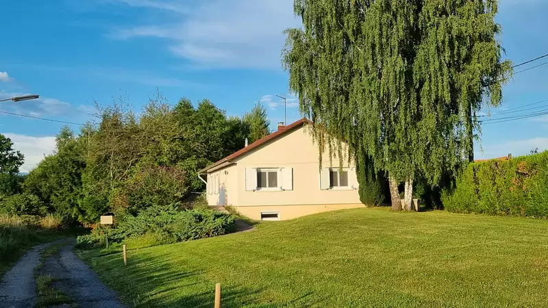 Dans un très bel environnement, au calme avec un cadre verdoyant, pas de vis à vis, à 10 minutes du Lac de Pierre-Percée, Pavillon type DONADINI de 1983 très bien entretenu de plus de 125 m² ( au total 155 m² hors garage - chaufferie et atelier ), de nombreux travaux réalisés ( isolation extérieur - pompe à chaleur - double vitrage - salle d'eau - etc.....) comprenant au rez de chaussée, hall d'entrée, cuisine équipée et aménagée ouverte sur salon-séjour avec cheminée et accès terrasse, 3 chambres, salle d'eau équipée, wc ( tout à l'égoût ), 1 pièce - possibilité salle de bains ) au sous-sol, garage 2VL avec porte motorisée avec partie atelier, buanderie-chaufferie ( pompe à chaleur et fioul chaudière Viessmann - cumulus thermodynamique ) - 1 salle d'eau avec wc, 1 chambre, 1 espace bureau, 1 cave. Terrain paysager d'une surface de 1392 m². Taxe foncière : environ 700 euros