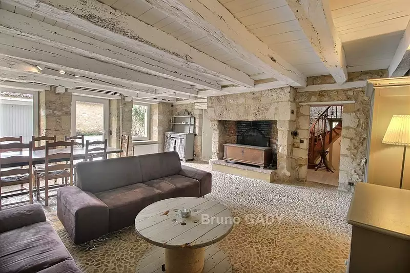 Ce bien est composé d'un beau séjour avec sol en pisé, grande cheminée, une cuisine équipée, deux grandes chambres, avec chacune sa salle d'eau, 3 WC.