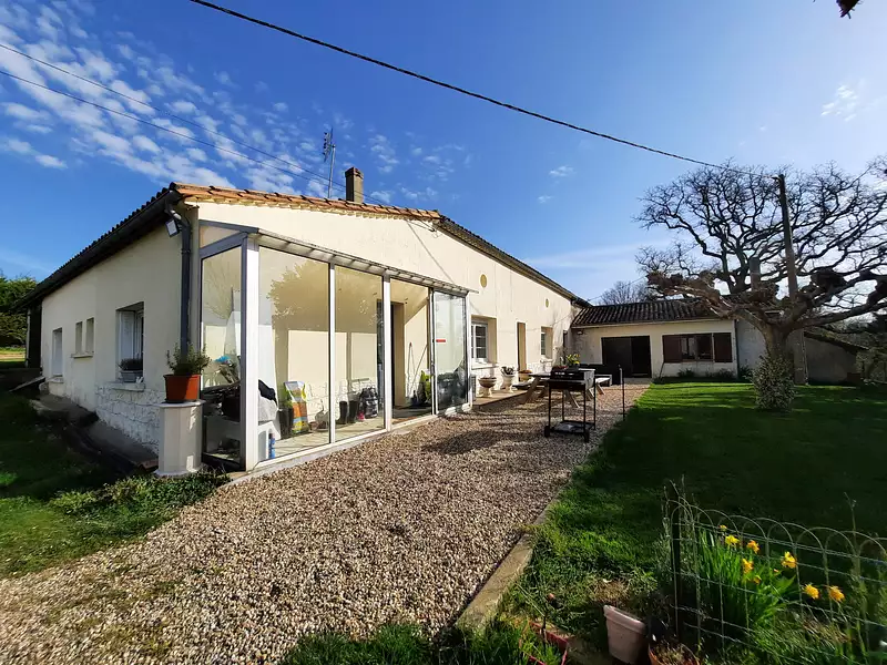 Agréable maison pierre de plain-pied rénovée, dans un environnement calme, diverses dépendances au cœur d'un parc de 5 hectares 2, en nature de prairies, verger et bois : Celle-ci comprend : Entrée 8m2, salon 30m2, cuisine équipée 16m2, salle à manger 23m2, salle d'eau de 5m2 avec WC, trois chambres de 12m2 à 14m2, WC. Dépendances attenantes : Garage 47m2, grange 81m2 avec étage de 43m2, appentis 48m2. Dépendance non attenante : Hangar de 125m2 avec appentis de 40m2. Chauffage pompe à chaleur air / eau, menuiseries PVC double vitrage, assainissement individuel fosse septique à prévoir, exposition Sud.