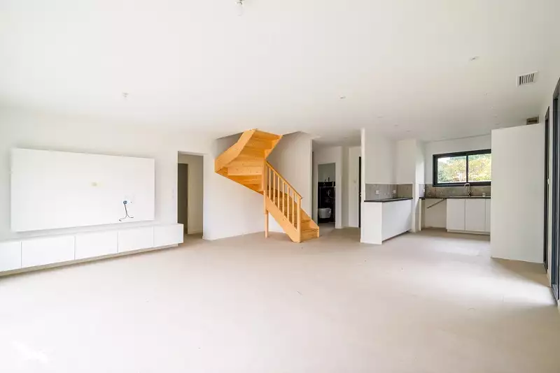 Maison contemporaine T5, située à quelques minutes du centre de Bruguières. Au rez-de-chaussée, une pièce de vie avec cuisine ouverte équipée, une chambre parentale avec salle d'eau, une buanderie et un garage. A l'étage, 3 chambres, une salle de bain, idéal pour un espace enfants. Parcelle cloturée de 400m². Proposition d'aménagement virtuel non contractuelle en dernière photo.
