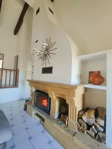 Le hall d'entrée s'ouvre sur un séjour cathédrale de 50m2 avec un espace salon et salle-à-manger équipé d'une superbe cheminée insert à laquelle vient s'ajouter un système de climatisation. Ce bel espace de vie dispose d'un accès direct sur la terrasse au Nord et également sur la deuxième terrasse pergola à l'Est, idéale pour les soirs d'été.