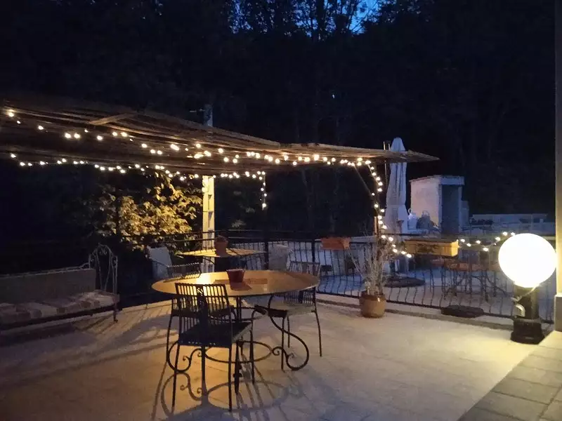 Sur les extérieurs, la piscine 7x3m avec coin balnéo, sans aucun vis à vis, dispose d'un large espace détente avec également un coin barbecue et accès à la terrasse pergola.