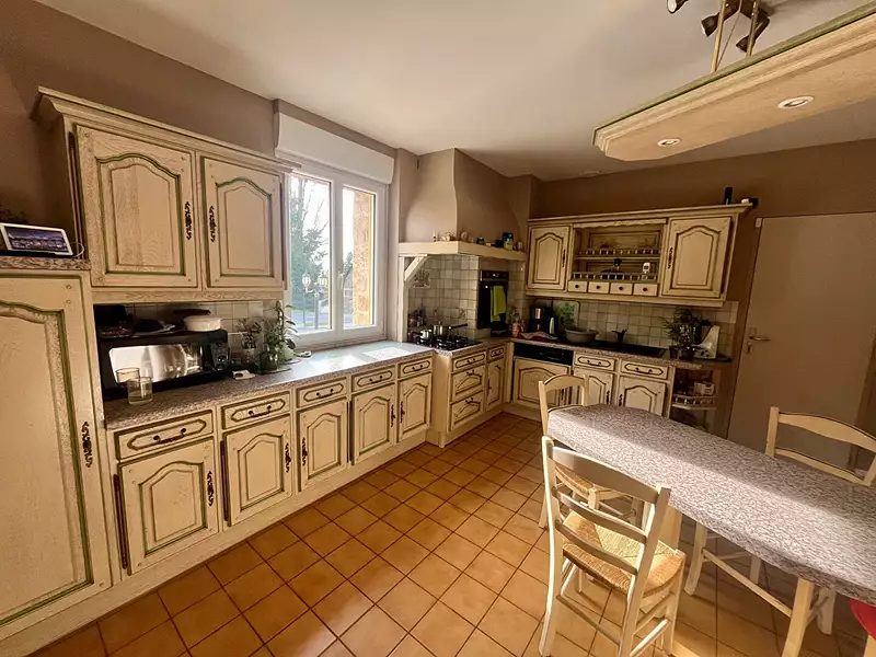 Proche Vitré, Maison type longère construite en 1984 comprenant au Rez- de -chaussée : une entrée, un salon-séjour avec insert, une cuisine séparée aménagée et équipée, une salle d'eau, une chambre avec placard, WC séparés. A l'étage, deux chambres de belle taille avec placards, une salle d'eau, WC, un grenier aménageable ainsi qu'un espace de stockage. Garage avec fosse et porte électrique. Une dépendance annexe en pierres d'environ 30m² pouvant être aménagée. Le tout sur un terrain de 1150 m². (4.40 % honoraires TTC à la charge de l'acquéreur.)