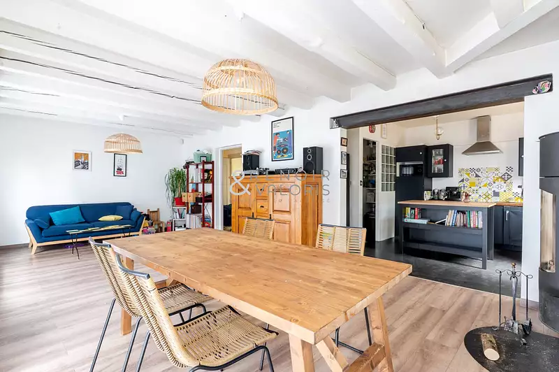 Elle se compose, au rez-de-chaussée, d'une entrée desservant une vaste et chaleureuse pièce de vie d'environ 30 m², exposée sud-ouest et équipée d'un poêle à bois.