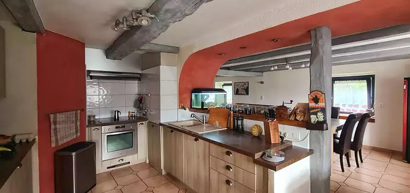 Cette charmante ferme rénovée vous accueille par une belle entrée lumineuse et spacieuse avec accès à une cuisine ouverte, entièrement équipée, qui s'ouvre sur une agréable pièce de vie et offre un accès à une superbe cave voûtée pleine de caractère.