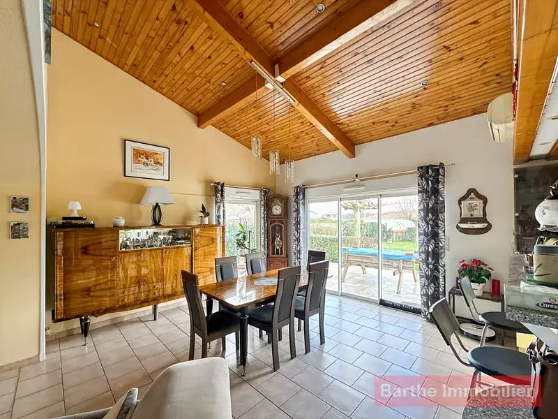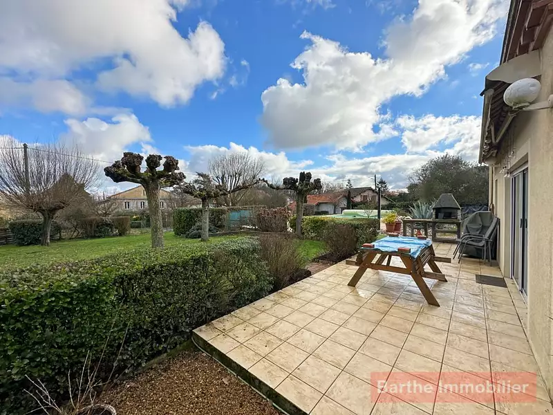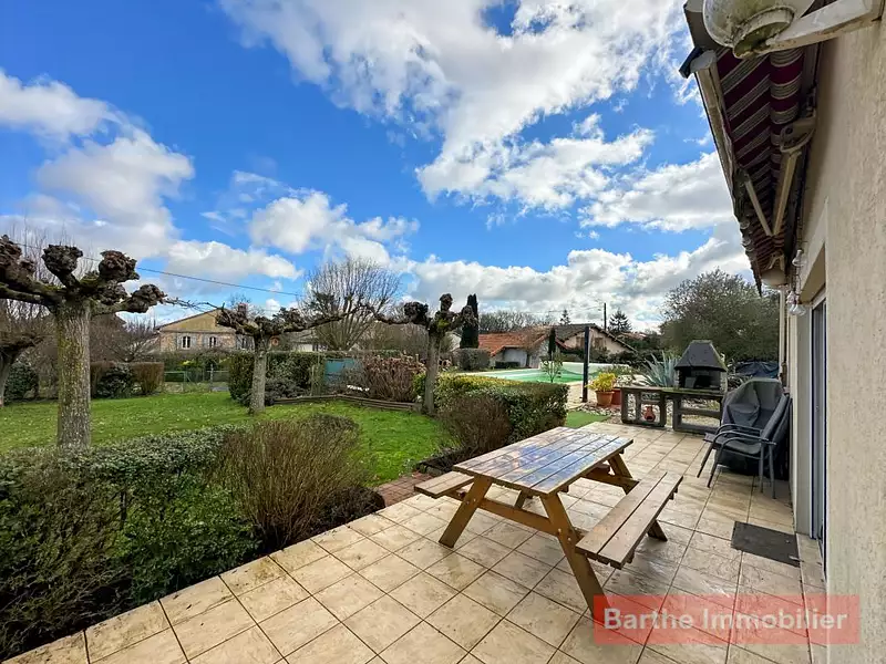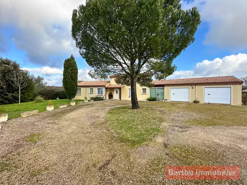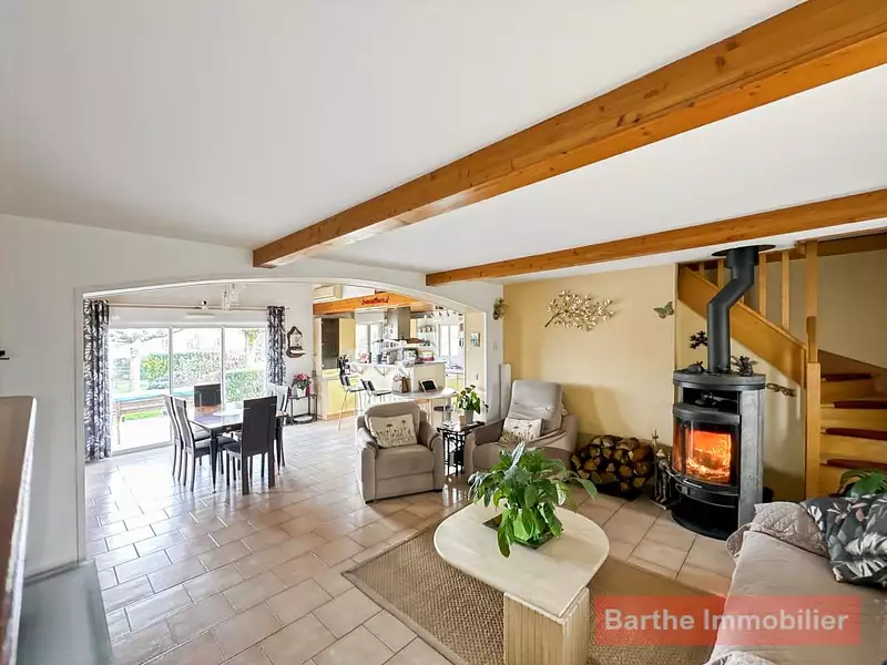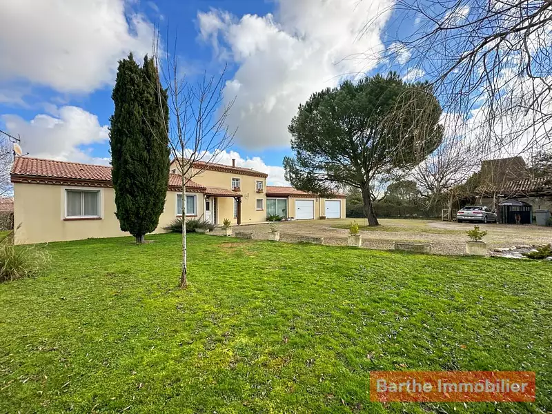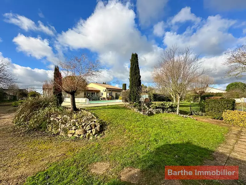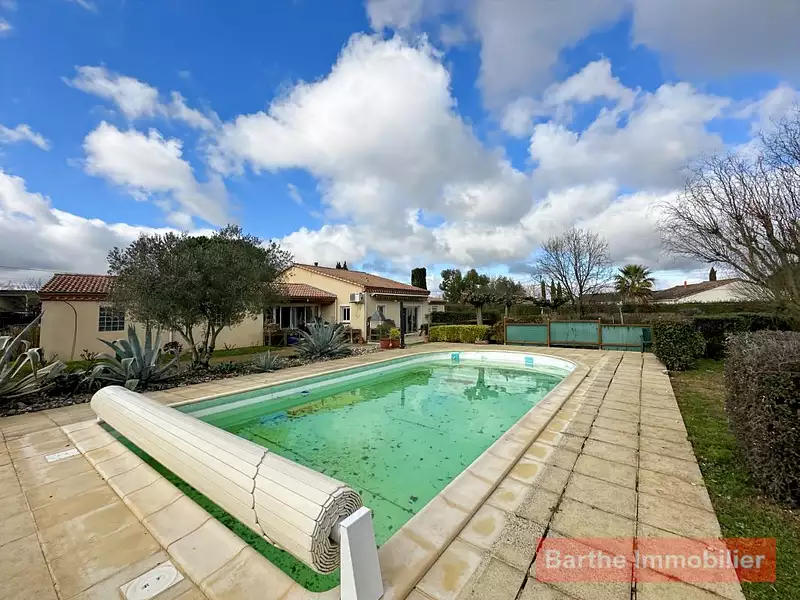 Maison de 2002 d'environ 125 m² de quasi plain pied sur terrain de 2760 m² clôturé avec piscine, double garage et dépendances.
