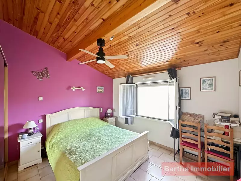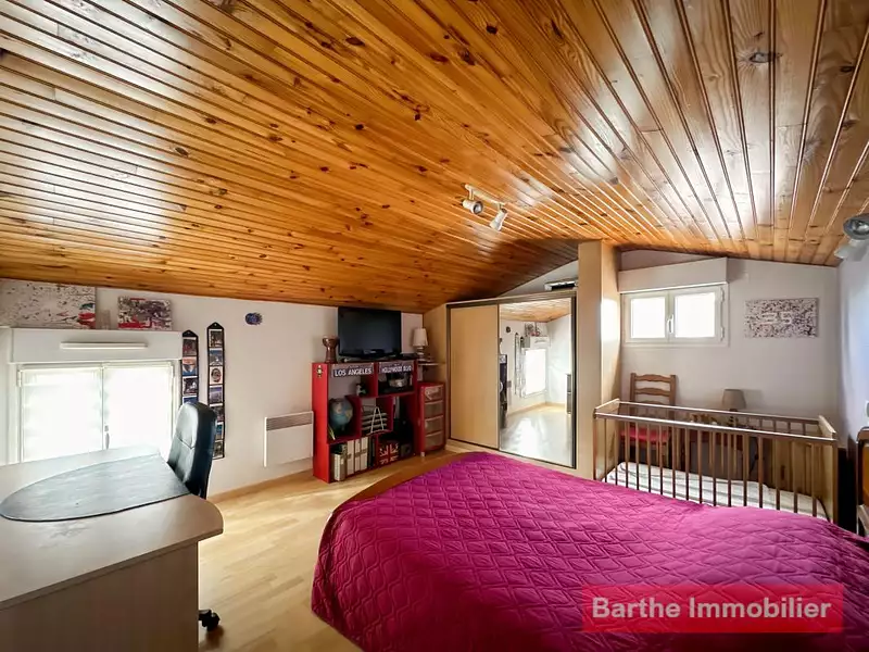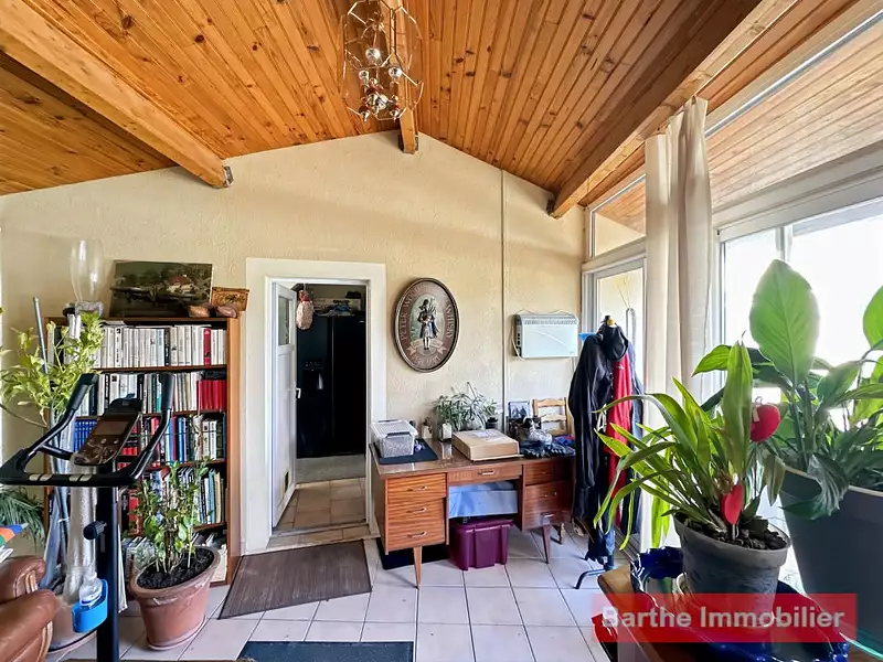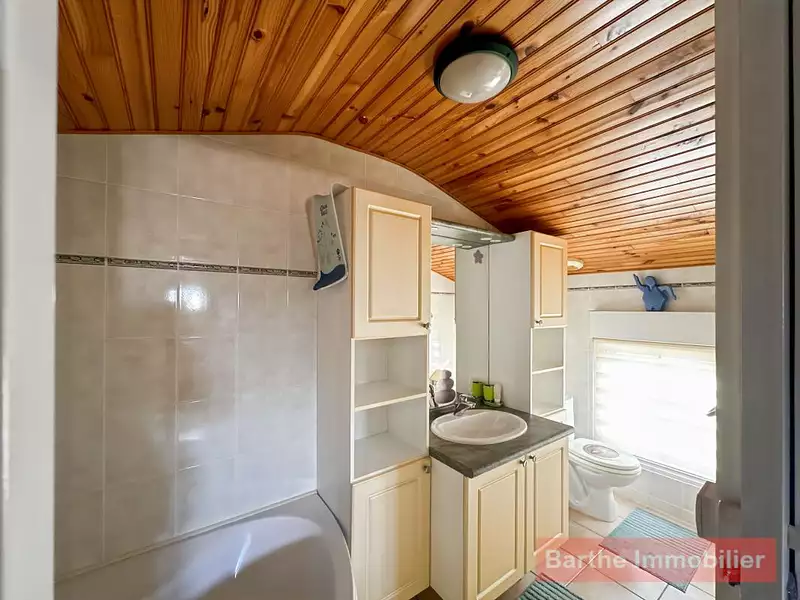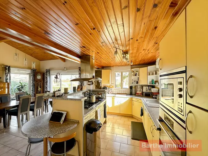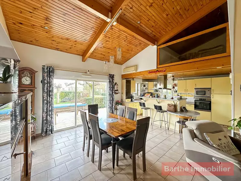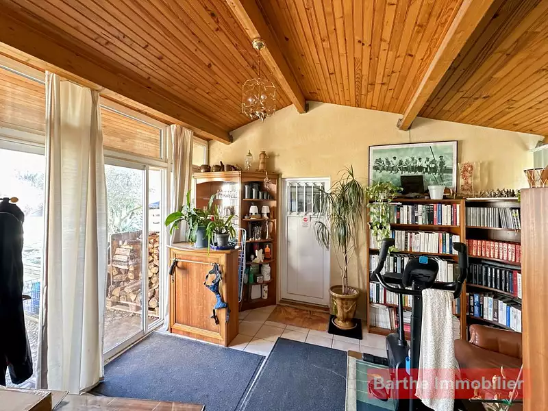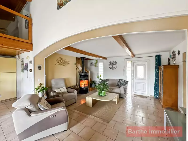 La maison comprend un séjour avec poêle à bois, cuisine ouverte aménagée (+cellier), une suite parentale avec Sde, 2 chambres, bureau, Sdb, wc. Véranda.