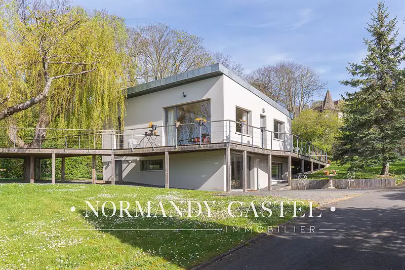 NORMANDY CASTEL vous présente cette maison contemporaine de 125m2 sur deux niveaux, située dans les mi-hauteurs de Trouville-sur-Mer, à 15min à pied de la plage et des commerces. Vous serez séduit par ses surprenants volumes, sa luminosité et son sens de circulation orienté sur les extérieurs. Le premier niveau offre deux belles chambres indépendantes, une salle de bains avec wc, une buanderie avec accès extérieur et un bureau avec accès indépendant pouvant être aménagé en chambre ou studio indépendant. Le niveau supérieur ayant également accès sur le jardin se compose d’une chambre séparée avec sa salle de douche, d’un wc indépendant, d’un beau séjour/salon avec cheminée et une cuisine indépendante qui s’articulent autour de deux grandes terrasses offrant à la fois une vue sur la mer et une vue sur le jardin arrière.