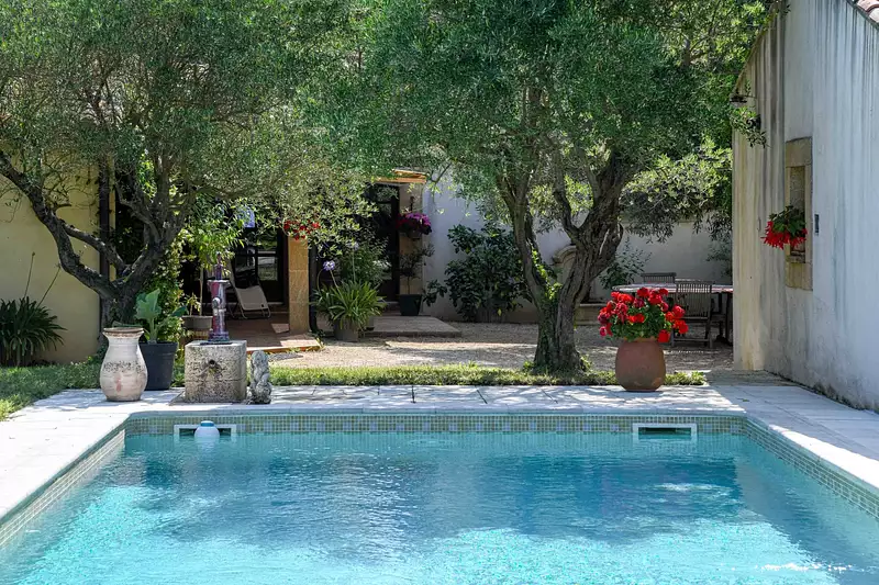 Jardin intime avec piscine 8 x 4.1m, garage, atelier, cave