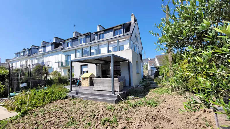 A Vendre dans un Quartier recherché, Maison T5 des années 60, rénovée en 2 appartement s (1 T4 et 1 T2bis) offrant de nombreuses possibilités. Au RDC, le T2 Bis profite d'une terrasse avec Pergola et d'un jardin bien exposé au sud. Il se compose d'une Pièce de vie avec Cuisine aménagée, 1Chambre, 1 Bureau et 1 Salle d'eau;. A l'étage, le T4 duplex profite d'une belle terrasse et d'une vue sur la Baie de Concarneau. Il se compose d'une entrée, D'une pièce de vie avec Cuisine AetE , le tout donnant sur la terrasse exposée Sud, 1 Chambre, SdE, WC au 1er. En duplex, 2 Chambres dont 1 avec Salle de bains privative, 1 Lingerie. La maison est idéalement située dans une ruelle calme proche de la voie verte, de la plage et du centre-ville. LA PLAGE A PIEDS !!! (4.99 % honoraires TTC à la charge de l'acquéreur.)