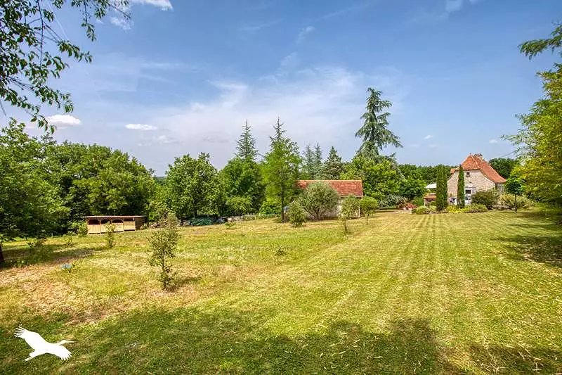 Belle maison en pierre de trois chambres dont une de plain pied. Garages pour véhicules, cuisine d'été et autres petites dépendances sur la parcelle. Terrain arboré et fleuri de plus de 9000 m².