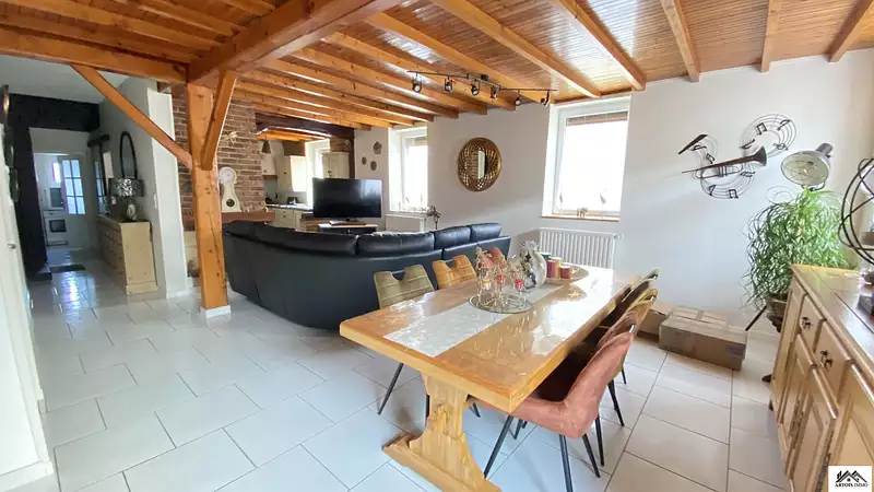 L'espace de vie est lumineux et totalement ouvert, salon avec son insert bois, séjour, cuisine américaine aménagée et équipée.