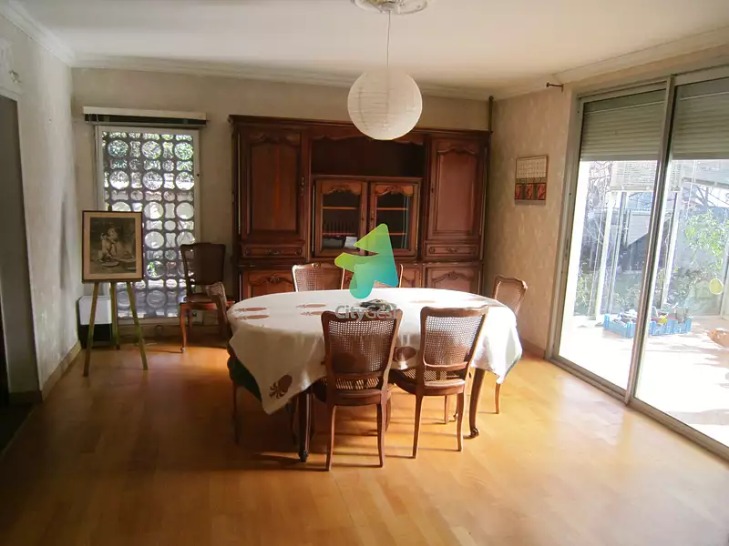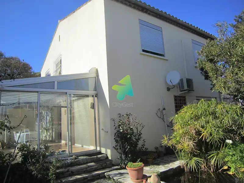 Narbonne, grande villa de type 7 sur 3 faces sur 344 m2 de terrain comprenant : rdc : entrée - cuisine équipée 12.22 m2 - séjour salon 33.87 m2 - 1 pièce (chambre ou bureau) 10.67 m2 - wc - A l'étage : hall - 5 chambres (11.22, 11.26, 10.60, 12.30 et 9.36 m2) - salle d'eau - wc - chauffage central gaz + climatisation à l'étage - puits - sh = 126.50 m2 false