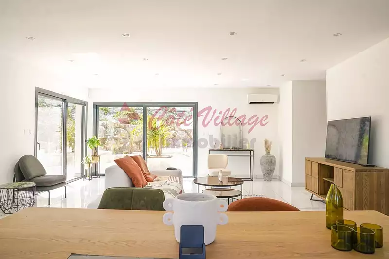 Un séjour avec cuisine ouverte équipée aménagée agrémenté de plusieurs baies vitrées et fenêtres pour une luminosité optimale.