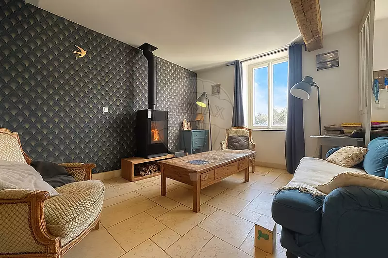 En entrant, vous accédez à un séjour convivial où un poêle à bois occupe une place centrale et diffuse une atmosphère douce et réconfortante. La cuisine, indépendante et entièrement aménagée avec ses équipements, est complétée par une arrière-cuisine et un espace buanderie. Un WC se trouve également au rez-de-chaussée pour plus de fonctionnalité au quotidien.