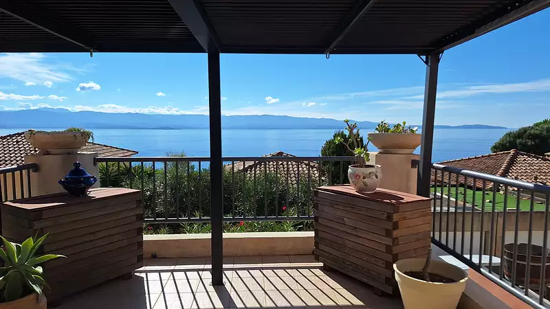 sur la célèbre route des Sanguinaires, dans une résidence prisée et sécurisée avec gardien; nous vous proposons cette agréable villa en partie dominante , éloignée des nuisances de la route. De type F4 / F5 sur 2 niveaux avec un agréable séjour de 45m2 ouvert sur une terrase vue mer panoramique sur le Golfe d'AJACCIO. Cuisine équipée avec une autre terrasse ext arborée; à l'étage 3 chambres. Prestations de qualité, pour une villa datant d'une vingtaine d'années. Garage de 30m2 prolongé d'une cave d'env 15m2. Extérieurement petit terrain de 400m2, mais proximité immédiate de l'espace naturel démaquisé d'une surface de 2000m2 , idéal pour détente, sans vis à vis.