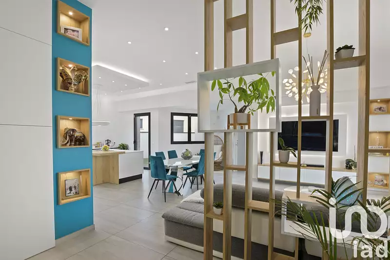 Un séjour de 60m² environ avec une cuisine ouverte entièrement aménagée et équipée et un cellier attenant.