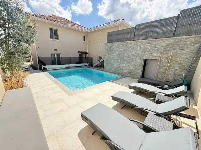 EXCLUSIVITE AGENCE MATESA IMMO, A VISITER RAPIDEMENT ! A PERON 01630, proche des écoles, des commerces, dans un lotissement familial en impasse, nous sommes ravis de vous présenter cette magnifique maison récente uniquement jumelée dans par le garage, d’une superficie de 127m2habitables avec un terrain attenant de 345m2 avec une piscine chauffée. La maison est en parfait état et bénéficie de très belles prestations générales. Elle est distribuée au rez-de-chaussée : une vaste entrée avec deux penderies équipées, un wc suspendu avec rangement et un lave-main, un espace de vie en L avec la cuisine entièrement équipée ouverte sur la salle à manger et le séjour avec un poêle à granules le tout donnant accès à la terrasse dallée avec un store électrique et un jardin exposé plein sud, une chambre salle de jeu. A l’étage : un dégagement, une buanderie aménagée avec fenêtre, trois chambres avec placards, une grande salle de bain avec une baignoire balnéo, une douche à l’italienne avec double vasque et un wc. En annexe : un garage avec porte automatique, et 2 places de parking, un abri jardin, une cave. On apprécie : sa luminosité, sa classe énergétique très performante, sa vue, pas de vis-à-vis, chauffage au sol sur les 2 niveaux, fibre optique et aucun travail à prévoir. Les informations sur les risques auxquels ce bien est exposé sont disponibles sur le site Géorisques http://www.georisques.gouv.fr Matesa immobilier, agence immobilière Pays de Gex, vente et achat maison villa péron 01630.