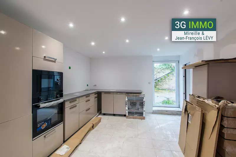 Depuis la nouvelle cuisine partiellement équipée ainsi que depuis le cellier, on accède à une cour intérieure, elle-même desservant le jardin situé en surplomb.