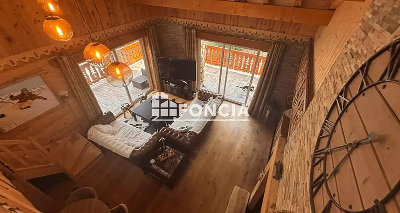 Au rdc : Une entrée avec ski room, vaste séjour avec toit cathédrale offrant une magnifique hauteur sous plafond, agrémenté d'une prestigieuse cheminée pour une ambiance cosy et montagne dans l'ensemble du logement.