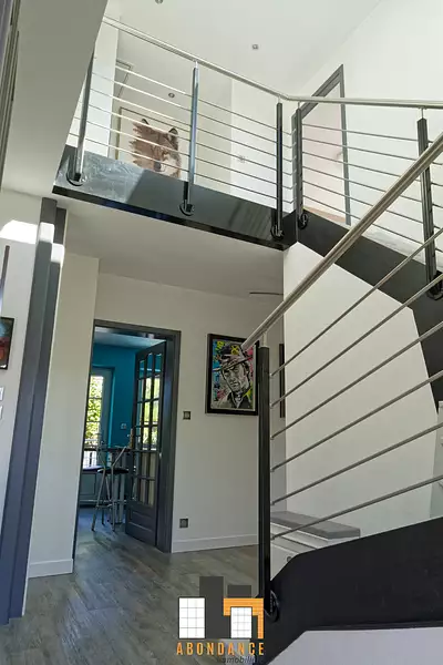RDC: grande entrée avec mezzanine, salon séjour de 27m2 + cuisine équipée Schmitt, 1 bureau ou chambre de 10.3m2, 1 salle de bains (baignoire + double douche) 1wc séparé.