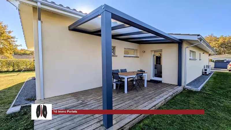A l'extérieur, deux terrasses bois, une exposée nord avec pergola et l'autre plein sud avec store ban électrique, cabanon de rangement, portail électrique et parking en enrobé pouvant accueillir 4 véhicules.