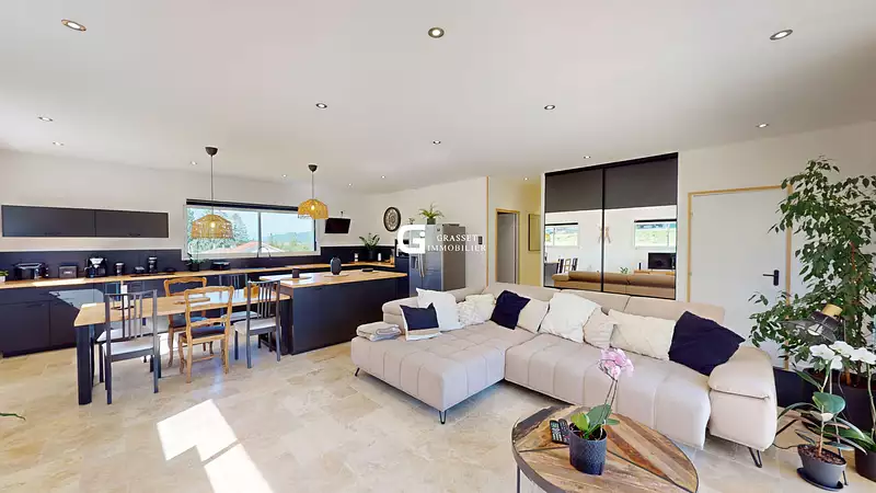 A Izernore 01580, découvrez cette maison neuve de 2024 d'une surface habitable de 129,25 m² offrant un cadre de vie agréable, lumineux et parfaitement agencé. Dès l'entrée, vous accédez à une vaste pièce de vie de 48,27 m² comprenant un séjour chaleureux et une cuisine ouverte, idéale pour partager des moments conviviaux en famille ou entre amis. L'espace nuit se compose de quatre chambres confortables dont une chambre principale de 13,55 m², une chambre de 11,95 m², une autre de 10,88 m² et une dernière de 9,79 m² pouvant faire office de bureau ou de chambre d'enfant. Deux salles de bains viennent compléter l'agencement intérieur, l'une de 4,09 m² avec douche et l'autre de 5,12 m² attenante à la chambre parentale avec un coin dressing. La maison dispose également d'un WC indépendant, d'une buanderie-chaufferie de 8,11 m² et d'un spacieux double garage de 67,85 m² qui permet de stationner plusieurs véhicules et offre un bel espace de stockage. Les menuiseries sont en double vitrage PVC et aluminium garantissant confort thermique et isolation. Idéalement située dans un quartier calme et recherché d'Izernore, cette maison moderne au fort potentiel représente une belle opportunité pour une vie de famille sereine et fonctionnelle.