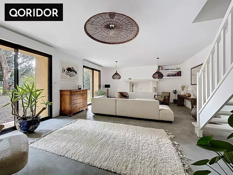 - un vaste séjour lumineux de près de 40 m², baigné de lumière grâce à ses deux baies vitrées au Sud et donnant sur le jardin. Son volume généreux permet d'y accueillir famille et amis en toute convivialité. Une cheminée y trône (conduit existant), idéale si vous souhaitez y installer un poêle à bois.