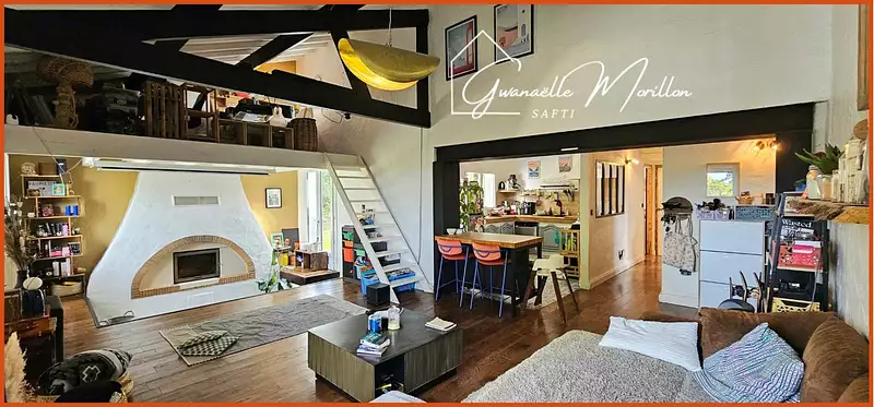 Dans la maison, la pièce de vie s’élève sous une superbe hauteur sous plafond, et s’organise autour d’un coin cheminée en contrebas où l’on s’imagine déjà passer les soirées d’hiver. Le parquet massif refait à neuf en 2021 réchauffe l’ensemble, la cuisine ouverte apporte de la convivialité, et la mezzanine peut faire une chambre supplémentaire ou un bureau... 2 chambres dont 1 avec mezzanine, 1 SDB, 1 WC indépendant et 1 buanderie complètent ce bel intérieur.