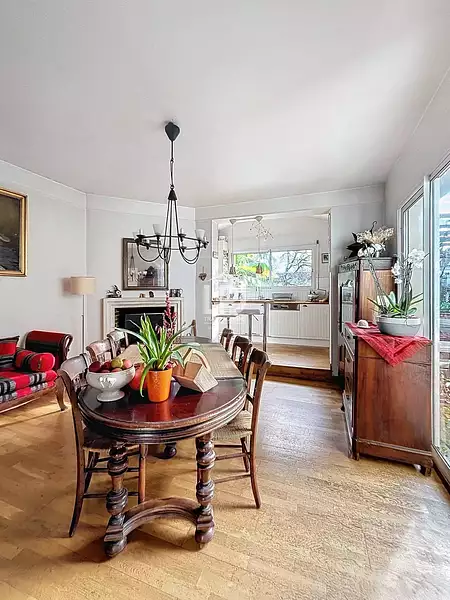 Une belle entrée avec des espaces de rangement permet d’accéder au séjour disposant d’un espace bibliothèque, dans lequel vous pourrez apprécier un moment de lecture tout en profitant d’une vue paisible sur le jardin. Cette vue est également offerte depuis la salle à manger, permettant de profiter du charme de sa cheminée et de sa cuisine ouverte.