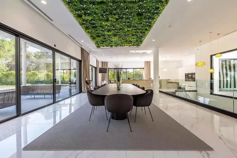 Le vaste séjour, baigné de lumière, s’ouvre sur une nature préservée et accueille une cuisine d’exception signée par un grand nom, où esthétique, innovation et raffinement se conjuguent pour séduire les plus exigeants des chefs.