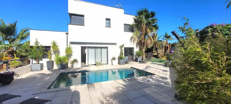 Agde 34300 - Villa contemporaine avec piscine et ascenseur Villa individuelle sur 678m² de terrain clos et arboré avec piscine au sel. Elle offre un vaste séjour lumineux avec cuisine américaine équipée, deux suites parentales et deux autres chambres supplémentaires, ascenseur desservant tous les niveaux, garage + grand sous-sol carrelé de 71m². Prestations haut de gamme : climatisation gainable, baies vitrées à galandage, volets roulants électriques, portail motorisé, vidéophone. Beau jardin paysager avec palmiers et stationnement pour plusieurs véhicules. Villa contemporaine, prête à vivre !. Honoraires charge vendeur. Inter-Med-Immo34 Agence du Cap d'Agde - Plus d'informations sur (réf. 34583244485)