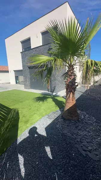 Jardin paysagé avec oliviers, bonsaïs, palmier, cocotier