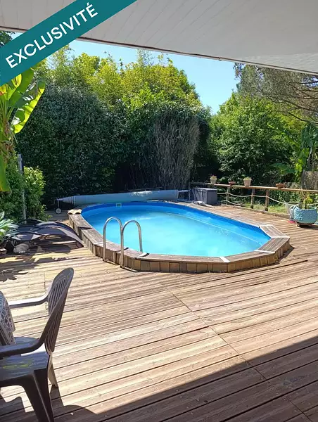 A l'arrière, la maison possède un jardin, véritable petit cocon à l’abri des regards avec une terrasse couverte et une piscine hors sol pour profiter des journées ensoleillées. L'extérieur, véritable atout invite à la détente et aux moments de partage en famille ou entre amis.
