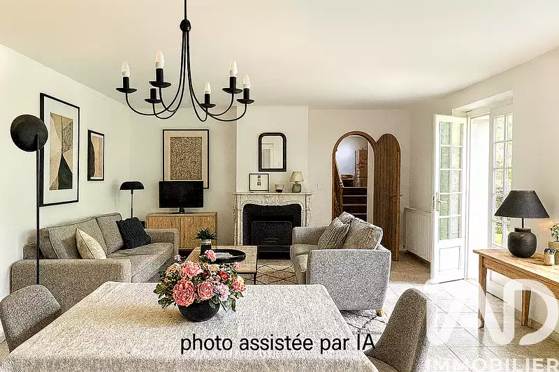 Une entrée ouvrant sur une lumineuse pièce de vie d’environ 42 m² avec cheminée, donnant directement sur le jardin.