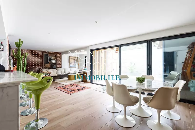 BORDEAUX - LE BOUSCAT, l'agence Monique Lecomte Immobilier vous propose à la vente cette belle maison contemporaine avec façade en pierre, de 130m2 sur une parcelle de 141m2, située dans une rue aussi calme que prisée du Bouscat, à proximité du centre, des écoles de renom (l'Assomption, Tivoli et Jeanne d'Arc), du Parc Bordelais, du Tram D et de la Barrière du Médoc. Elle se compose d'une entrée, d'un séjour avec cuisine ouverte donnant sur une terrasse d'environ 50m2 exposée sud-est, une chambre, une salle d'eau et une lingerie. A l'étage se trouvent 2 chambres dont une avec salle d'eau, et une suite parentale avec salle de bains complète, ouvrant sur une terrasse. Une maison pleine de charme, dans un environnement d'exception. DPE en cours. (5.00 % honoraires TTC à la charge de l'acquéreur.)