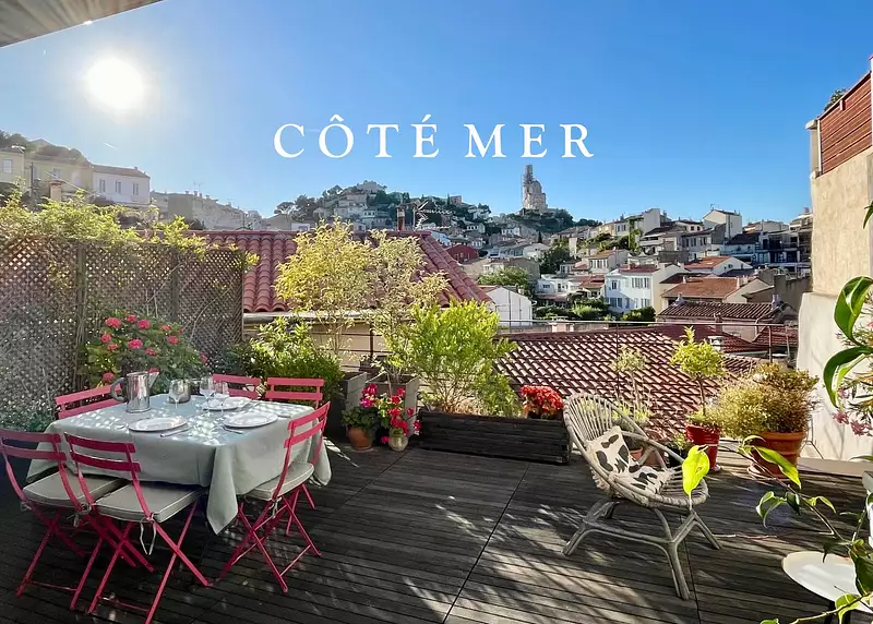 Au r+1, un vaste séjour traversant sud-est/nord-ouest donne directement sur la grande terrasse, face à Notre-Dame de la Garde et sa jolie colline. Le côté traversant apporte beaucoup de lumière tout au long de la journée. La terrasse est ombragée à l'heure du déjeuner et ensoleillée à l'heure de l'apéritif, idéale après une bonne journée de travail.