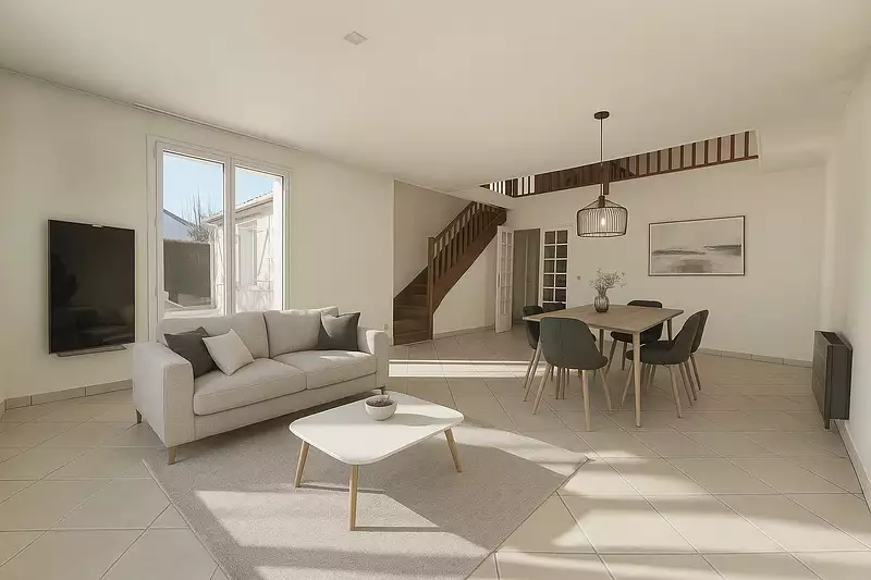 Une vaste entrée cathédrale avec puits de lumière et grand placard, cuisine aménagée et équipée indépendante et dinatoire, séjour double cathédrale avec deux portes fenêtres exposé SUD et EST permettant une pièce de vie lumineuse et chaleureuse avec accès à la terrasse et au jardin sans aucun vis-à-vis.