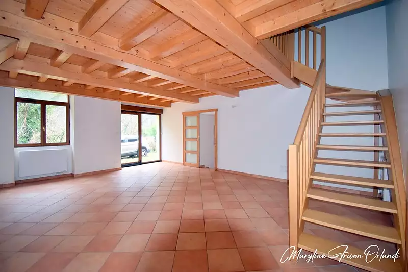 C'est avec plaisir que je vous présente cette ancienne fruitière récemment rénovée, située à Saint-Thibaud-de-Couz, à seulement 15 minutes de Chambéry et 8 minutes de Cognin. Nichée au bout d'une impasse et attenante à un vaste bois privatif de 4 130 m², cette maison mitoyenne offre calme et sérénité à ses futurs occupants.