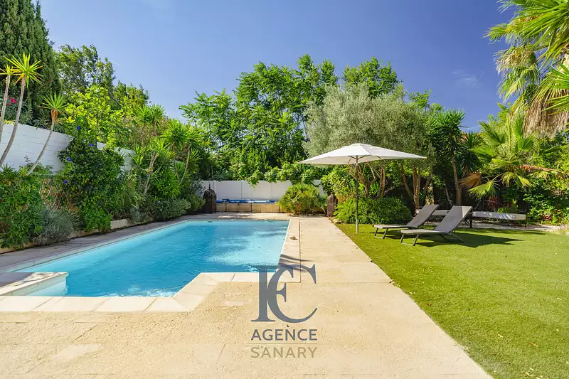 À l’extérieur, la propriété bénéficie d’une superbe piscine au sel, entourée d’un jardin joliment aménagé et facile d’entretien.