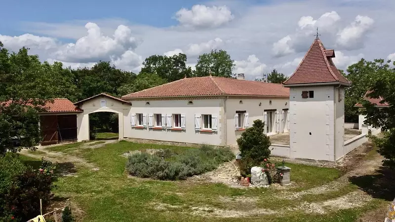 A l'extérieur, sur un terrain d'environ 3497m2 clôturé, un triple garage, et deux pigeonniers utilisés pour du stockage.