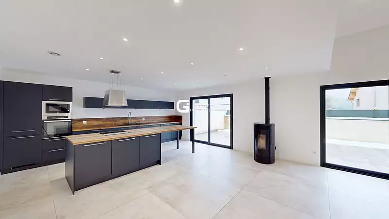 Située à Oyonnax (01100), cette maison contemporaine construite en 2021 se déploie sur deux niveaux et offre un cadre de vie moderne, lumineux et parfaitement adapté à une famille. Édifiée sur un terrain agréable, elle bénéficie de prestations récentes et de larges baies vitrées en aluminium qui inondent les espaces de lumière naturelle. Au rez-de-chaussée, une grande pièce de vie regroupant cuisine ouverte, séjour et salle à manger crée un espace convivial et chaleureux. Une chambre, un WC indépendant ainsi qu'une buanderie complètent ce niveau. Le garage carrelé, accessible depuis l'intérieur, apporte un réel confort au quotidien. La pièce de vie s'ouvre sur une terrasse carrelée idéale pour profiter des beaux jours. A l'étage, la maison propose une mezzanine pouvant accueillir un bureau ou un espace détente. Vous y trouverez également trois chambres, dont une chambre parentale disposant de sa propre salle d'eau et d'un dressing. Une salle de bains avec baignoire vient compléter cet étage, offrant un confort optimal pour toute la famille. A l'extérieur, trois places de stationnement complètent ce bien mitoyen qui séduit par ses volumes, son confort moderne et son ambiance chaleureuse, soulignée notamment par la présence d'un poêle à granulés. Une maison récente, fonctionnelle et accueillante, à découvrir sans tarder.