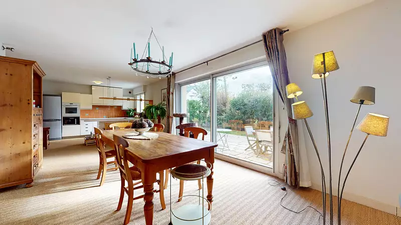 Environnement préservé et boisé pour cette villa offrant un salon-cuisine de 55m2 avec cheminée et accès direct sur le jardin.